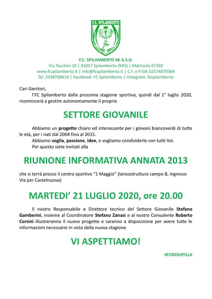 Questa sera, alle ore 20.00 presso il centro sportivo “1 Maggio” (tensostruttura campo B, ingresso via per Castelnuovo), è in programma la riunione informativa sul nostro Settore Giovanile, aperta a tutti i genitori dei ragazzi nati nel 2013, in vista della prossima stagione.Vi aspettiamo!